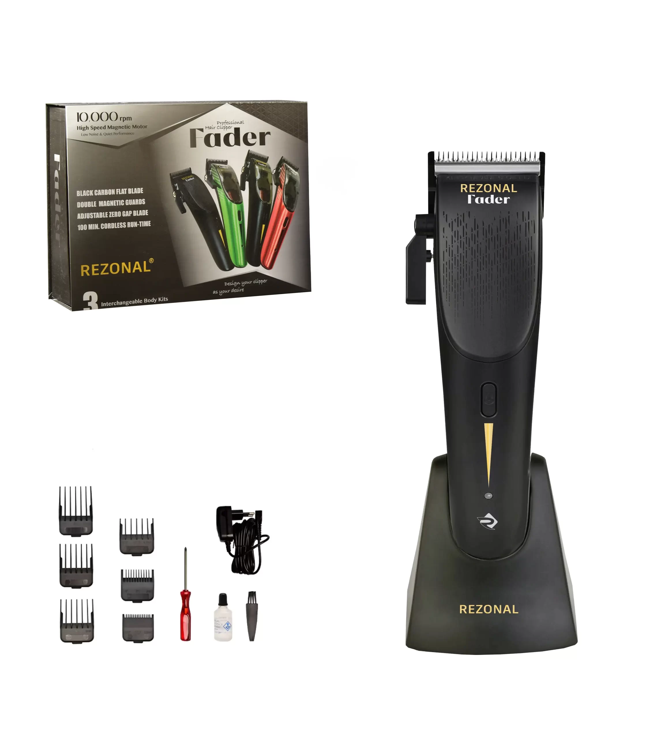 این دستگاه به همراه ۳ قاب اضافی در رنگ‌های مشکی، طلایی و متال گان، آچار مخصوص، برس تمیزکننده، روغن تیغه و استند شارژ ارائه می‌شود تا دستگاه همیشه آماده و حرفه‌ای باشد.